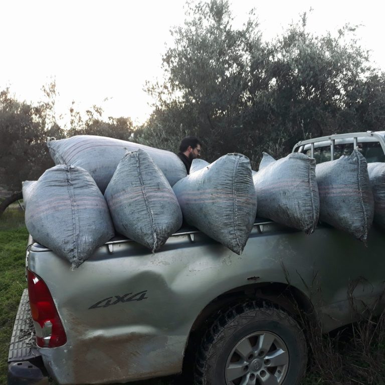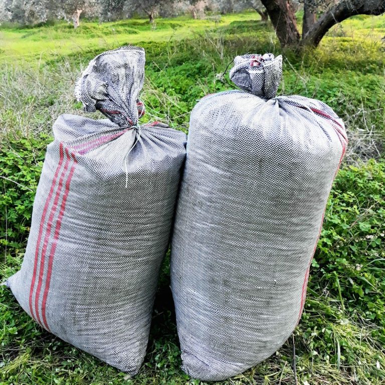Nach der Ernte werden die Oliven in Säcken gesammelt. Der ganze Prozess ist ein Zusammenspiel von Tradition und modernem Handwerk. Die Säcke werden sorgfältig gelagert und dann schnellstmöglich zur befreundeten Ölmühle transportiert. Zeit ist wichtig, denn je frischer die Oliven verarbeitet werden, desto besser wird das Öl.