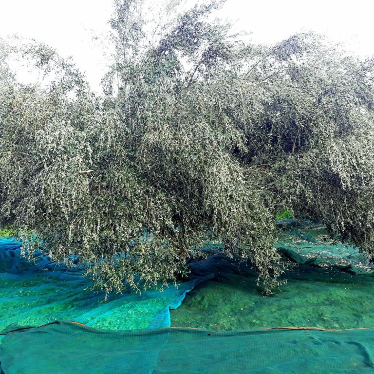 Zur Erntezeit werden unter jedem Baum Netze ausgelegt. Die Bäume werden von Hand geschüttelt, keine großen Maschinen kommen zum Einsatz. Meine Familie und viele befreundete Helfer arbeiten zusammen. Die Oliven fallen sanft in die Netze und werden dann sorgfältig in Säcke verpackt.